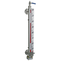 液位計(jì)根據(jù)浮力原理和磁性耦合作用研制而成。當(dāng)被測容器中的液位升降時(shí),液位計(jì)主導(dǎo)管中的浮子也隨之升降,浮子內(nèi)的永久磁鋼通過磁耦合傳遞到現(xiàn)場指示器,驅(qū)動紅、白翻柱翻轉(zhuǎn)180º,當(dāng)液位上升時(shí),翻柱由白色轉(zhuǎn)為紅色,當(dāng)液位下降時(shí),翻柱由紅色轉(zhuǎn)為白色,指示器的紅、白界位處為容器內(nèi)介質(zhì)液位的實(shí)際高度,從而實(shí)現(xiàn)液位的指示。